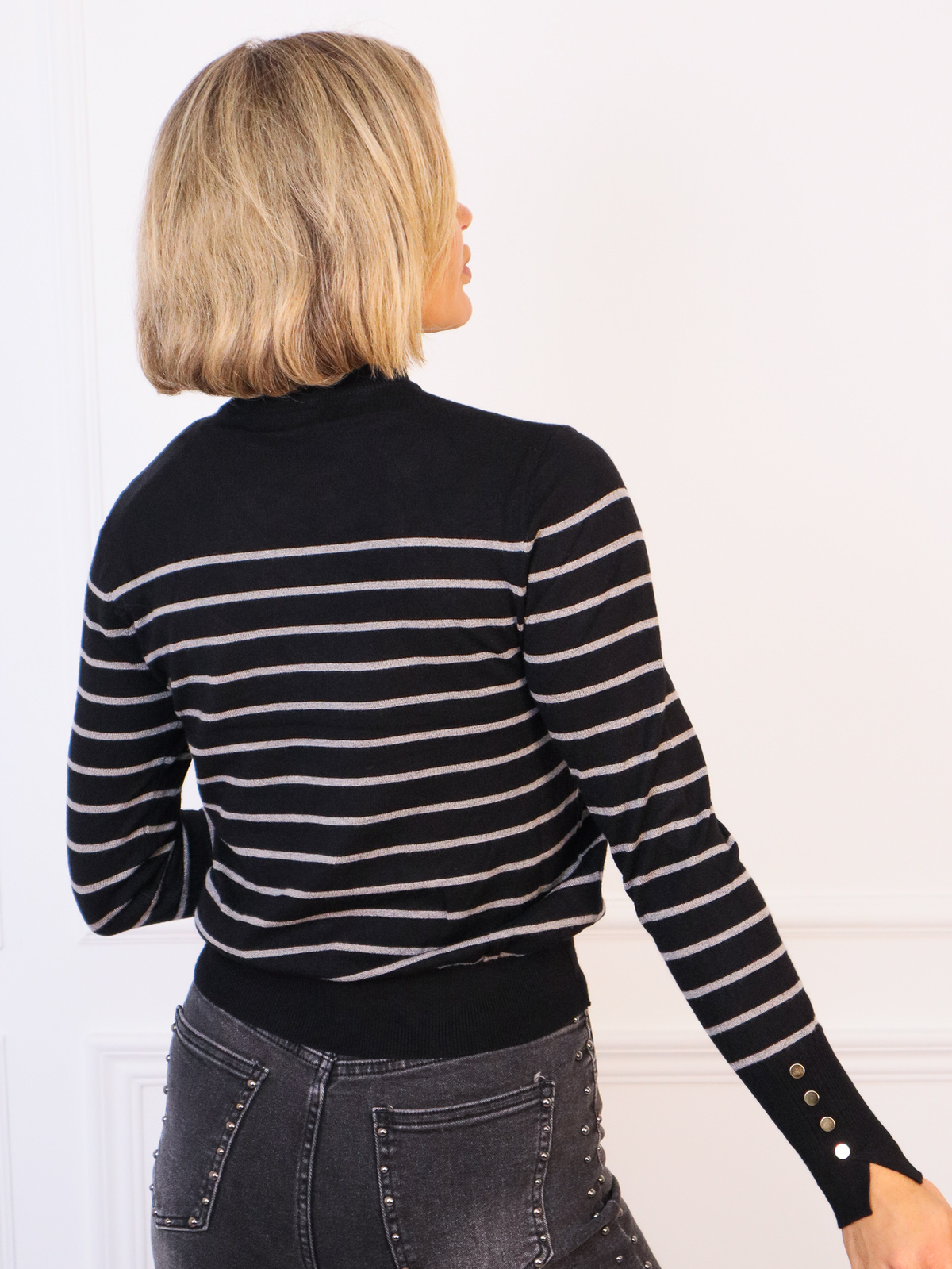 Sweterek dzianinowy w paski z półgolfem. Na rękawie ma złote ozdobne guziki.