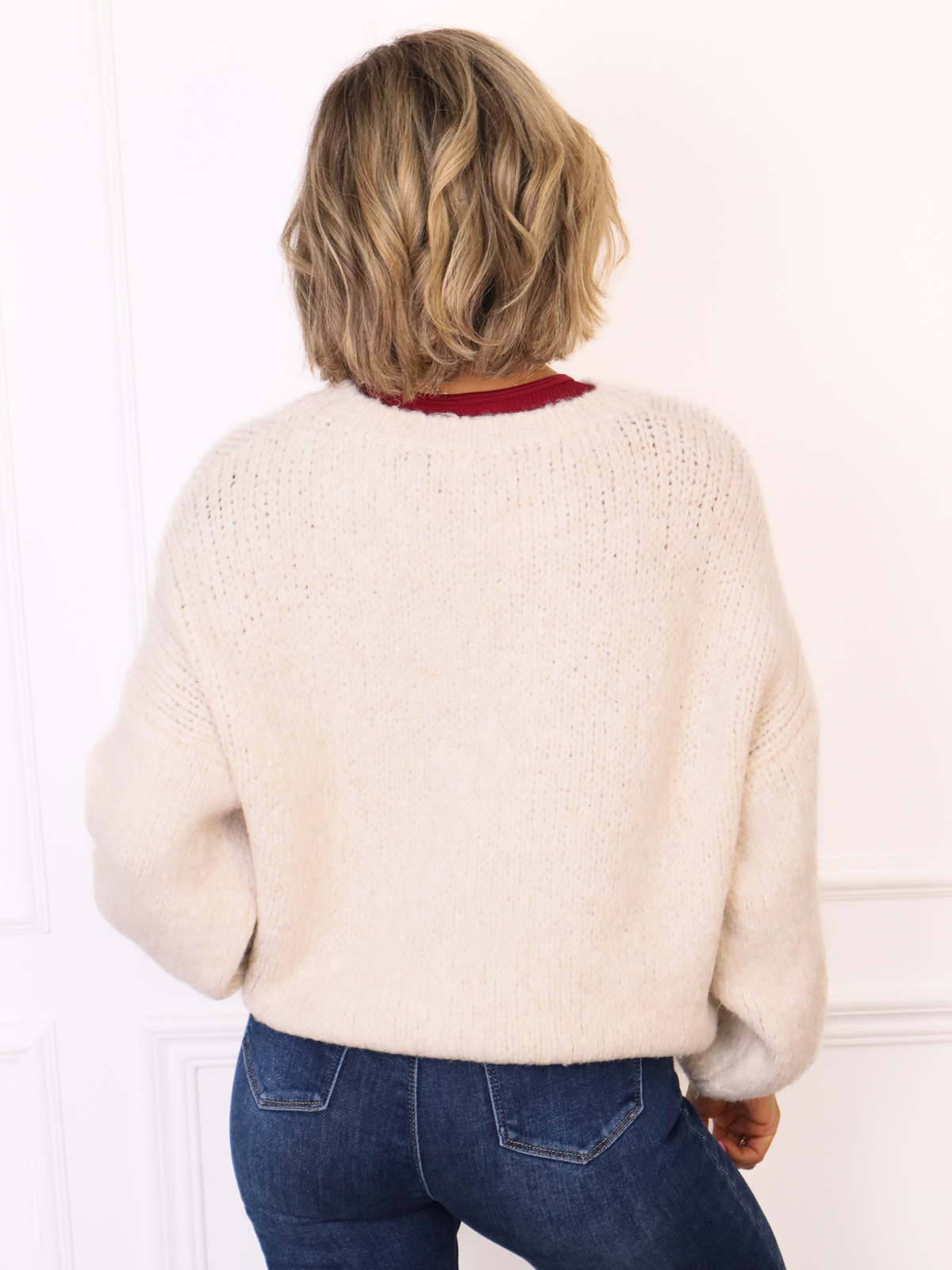 SWETER OVERSIZE Z WARKOCZOWYM SPLOTEM Z PRZODU- ECRU