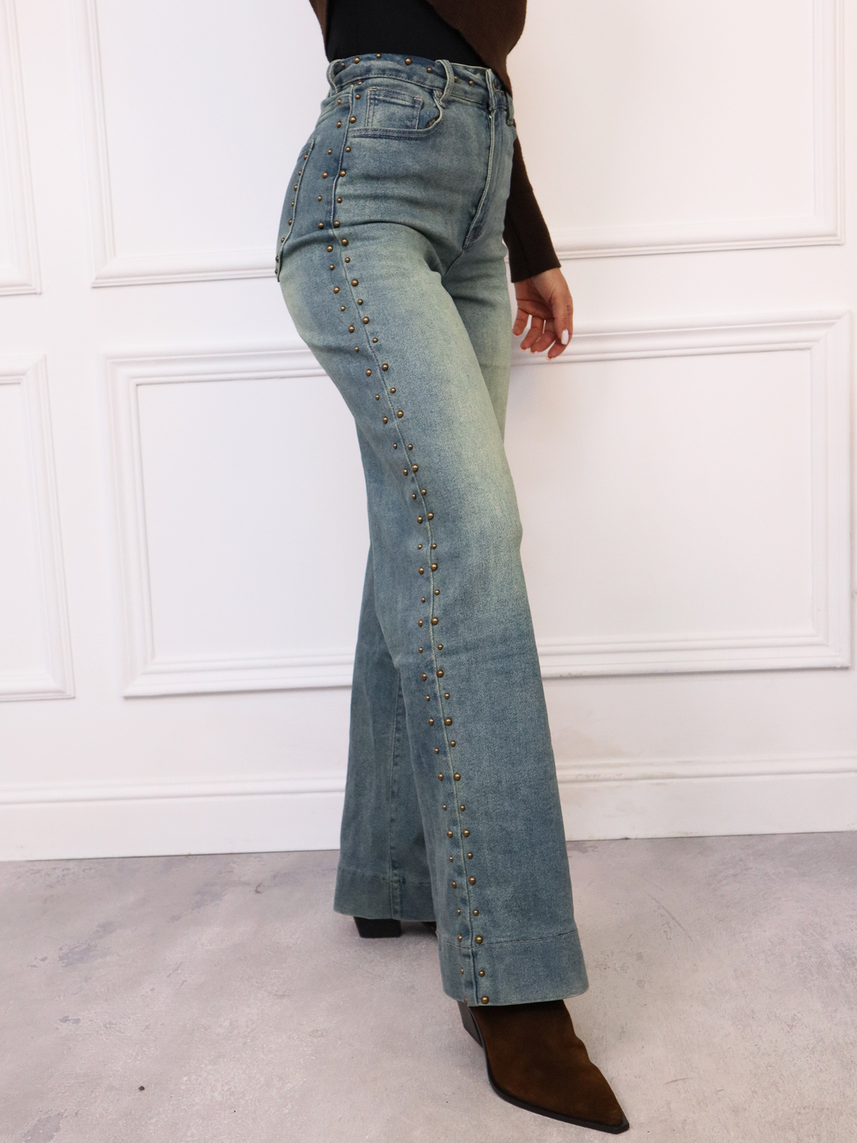Spodnie jeansowe z szerokimi nogawkami i ozdobnymi dżetami po bokach.