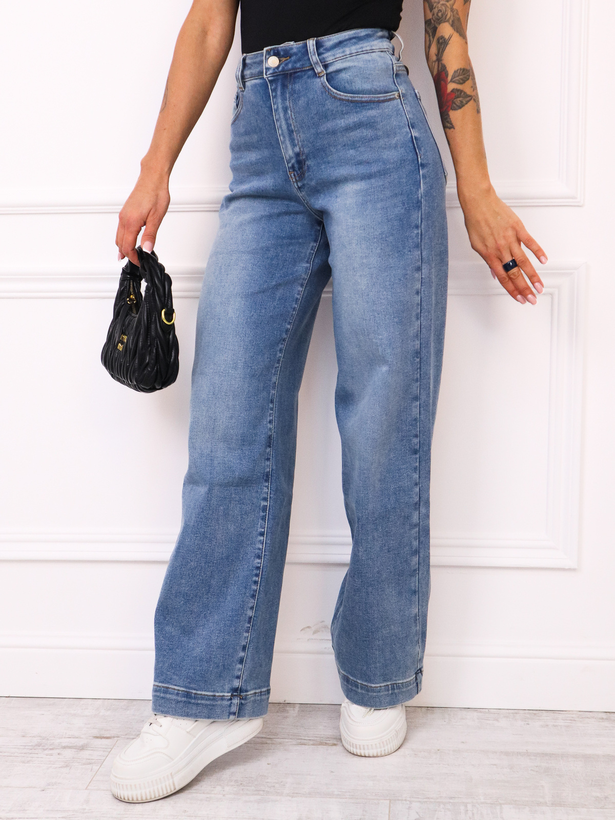 Spodnie jeansowe z wysokim stanem i szerokimi nogawkami.