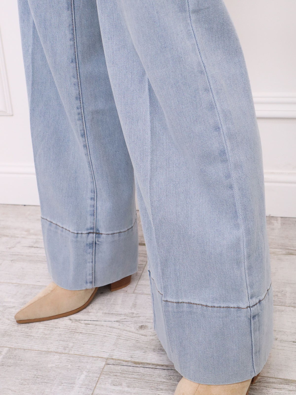 Spodnie jeansowe charakteryzują sięwysokim stanem i szerokimi nogawkami. Dół nogawek jest wykończony szerokim, podwiniętym mankietem.