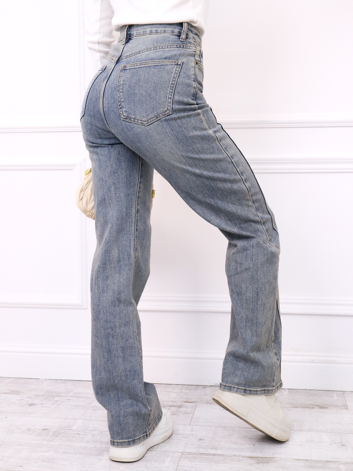 Spodnie jeansowe z przeszyciami na nogawkach. Szerokie nogawki i wysoki stan.