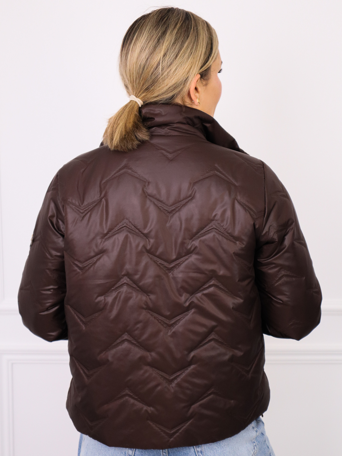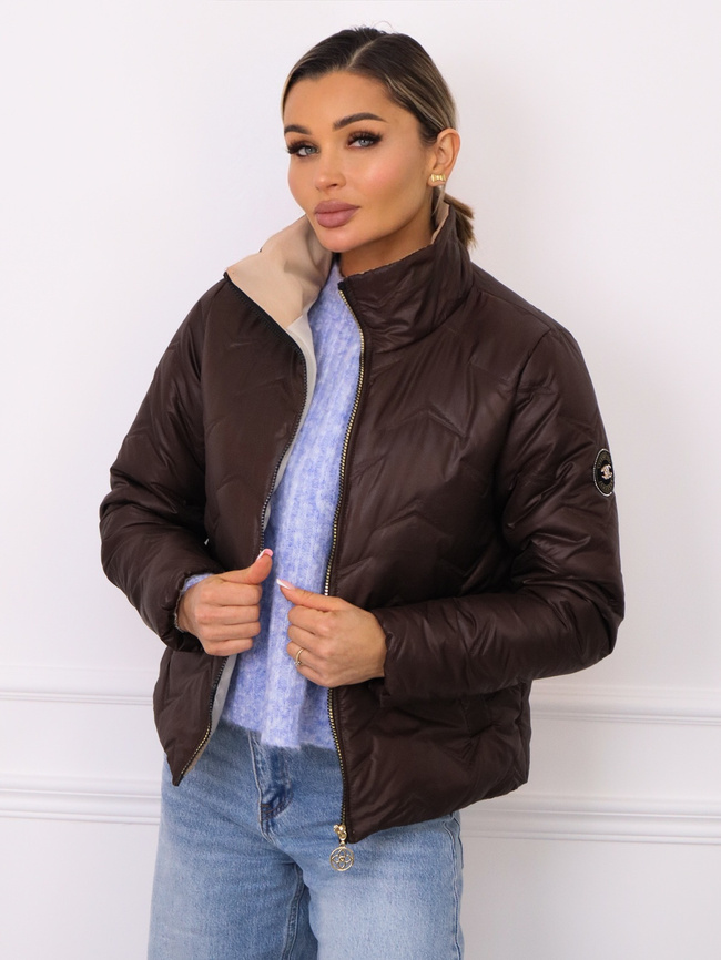 Kurtka przejściowa, pikowana ze ściągaczami po bokach i naszywką na rękawie.