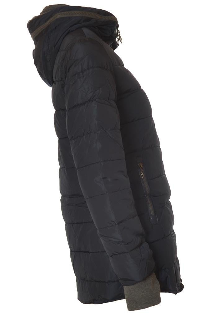 Grafitowa , ortalionowa kurtka pikowana. Posiadam kaptur z bawełnianą podszewką oraz z zamkami. Środek kurtki jest ocieplany futerkiem. Na końcach rękawów są ściągacze.