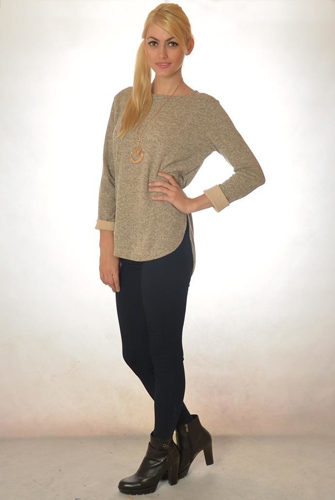 Beżowa, asymetryczna bluzka z wisiorkiem z motylkiem.