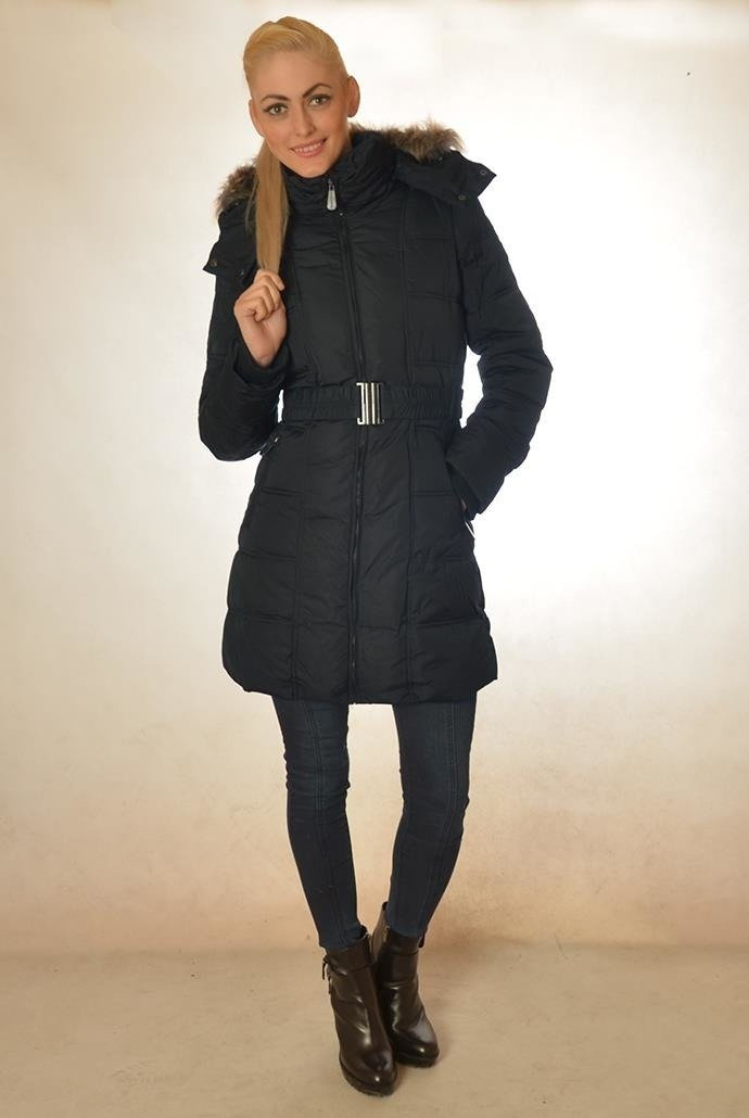 Czarny płaszcz zimowy zapinany na zamek oraz klamrę w pasie. Możliwość odpinania kaptura. Kaptur obszyty sztucznym lisem.