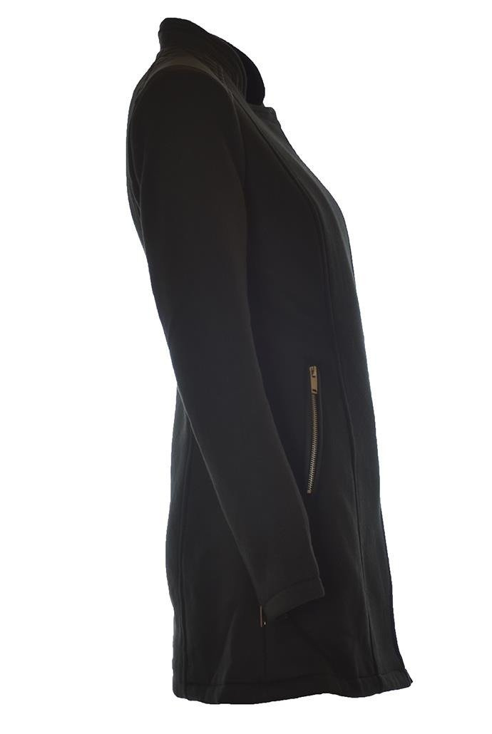 Czarny płaszcz zimowo-jesienny zapinany na zamek. Skórkowe elementy przy zamku, kieszeniach oraz na ramionach.