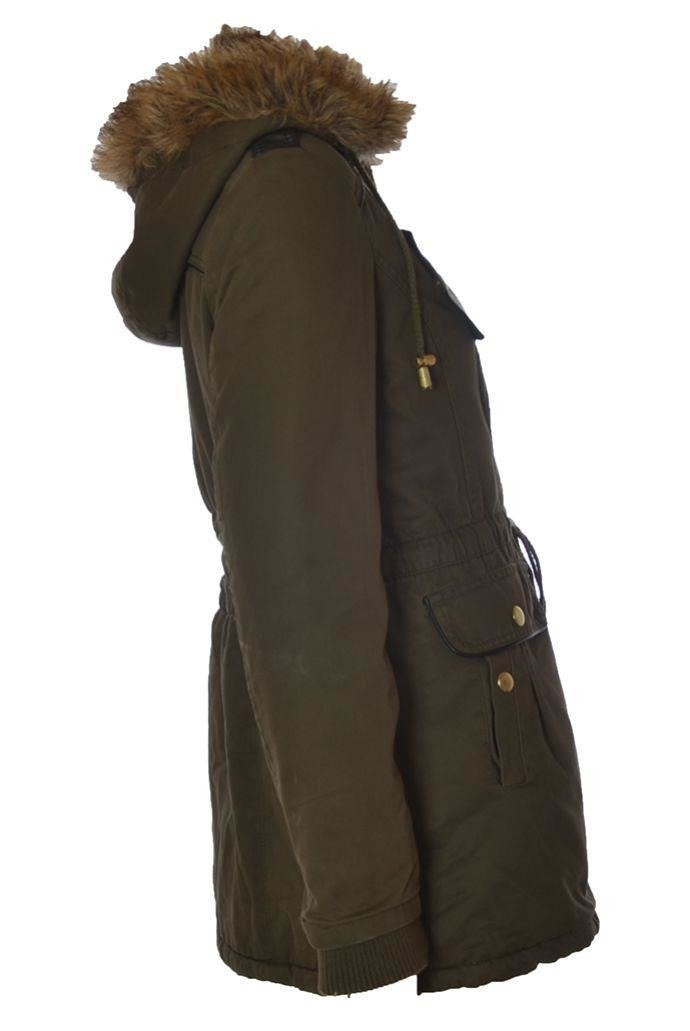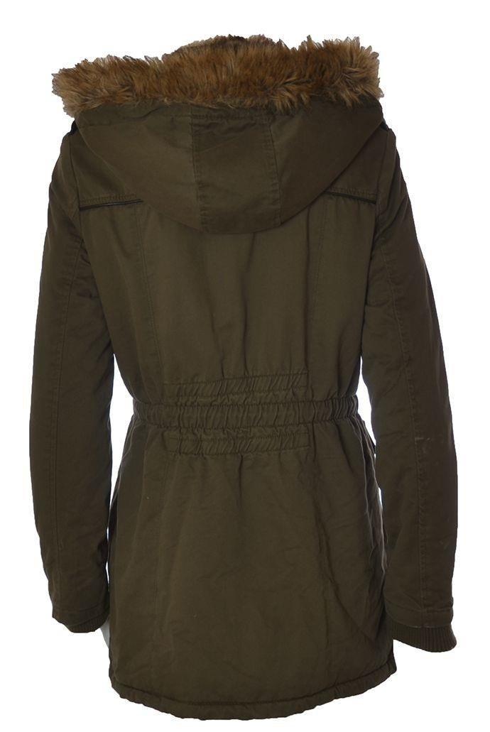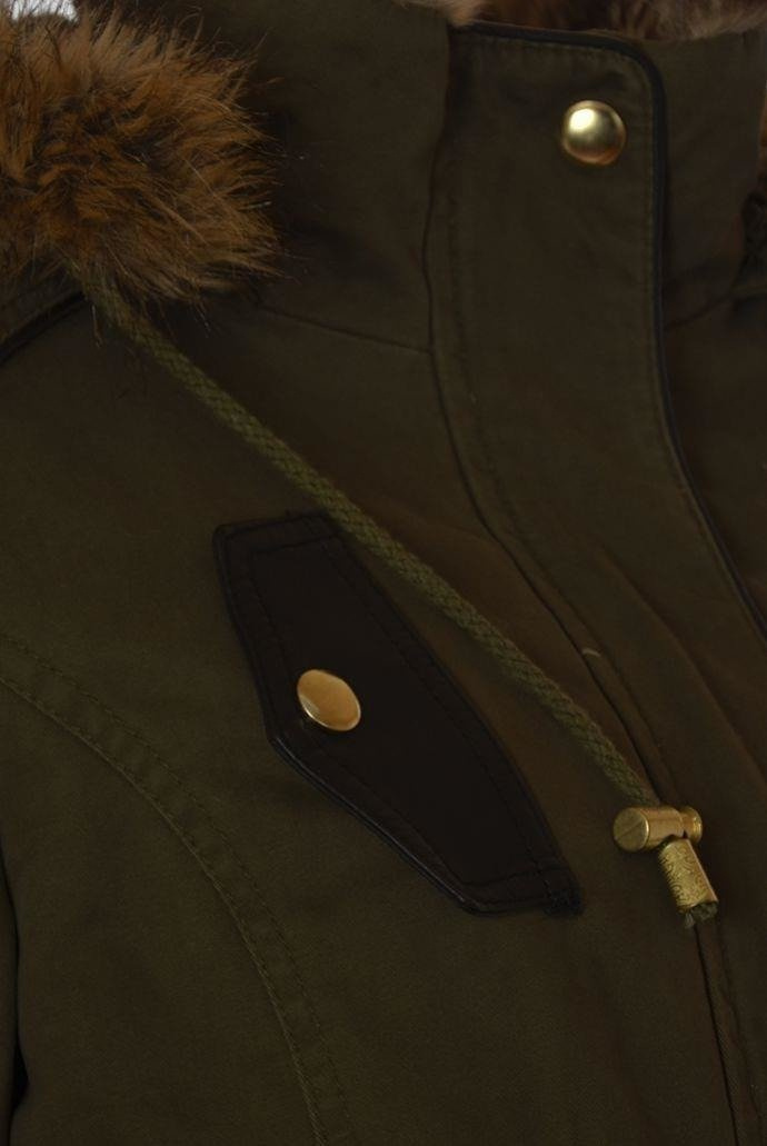 Bardzo ciepła, dłuższa kurtka z kapturem wykończonym futerkiem. Zapinana na zamek , oraz guziki, wiązana w talii, cztery kieszenie z przodu ze wstawkami skóry ekologicznej.