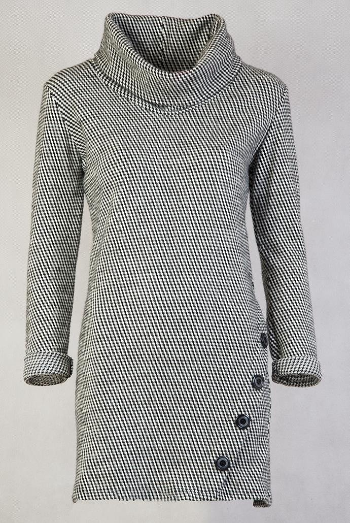 Biało-czarna tunika na długi rękaw z 4 guzikami na dole.