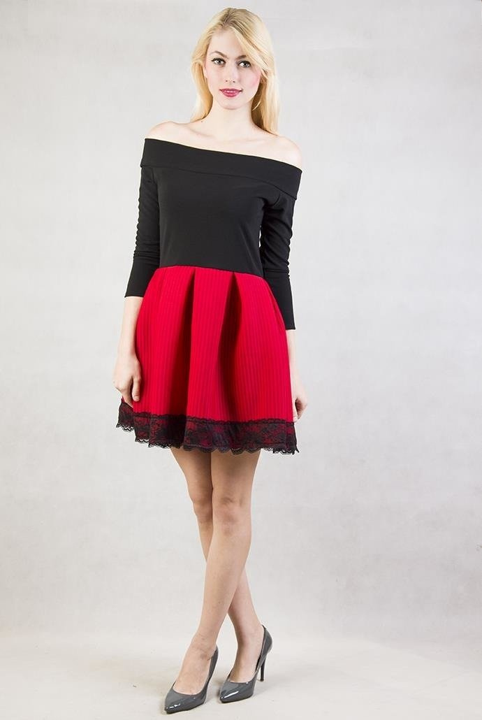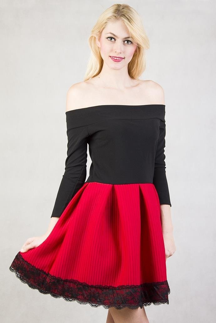 Czarno-czerwona sukienka rozkloszowana, obszyta koronką u dołu.