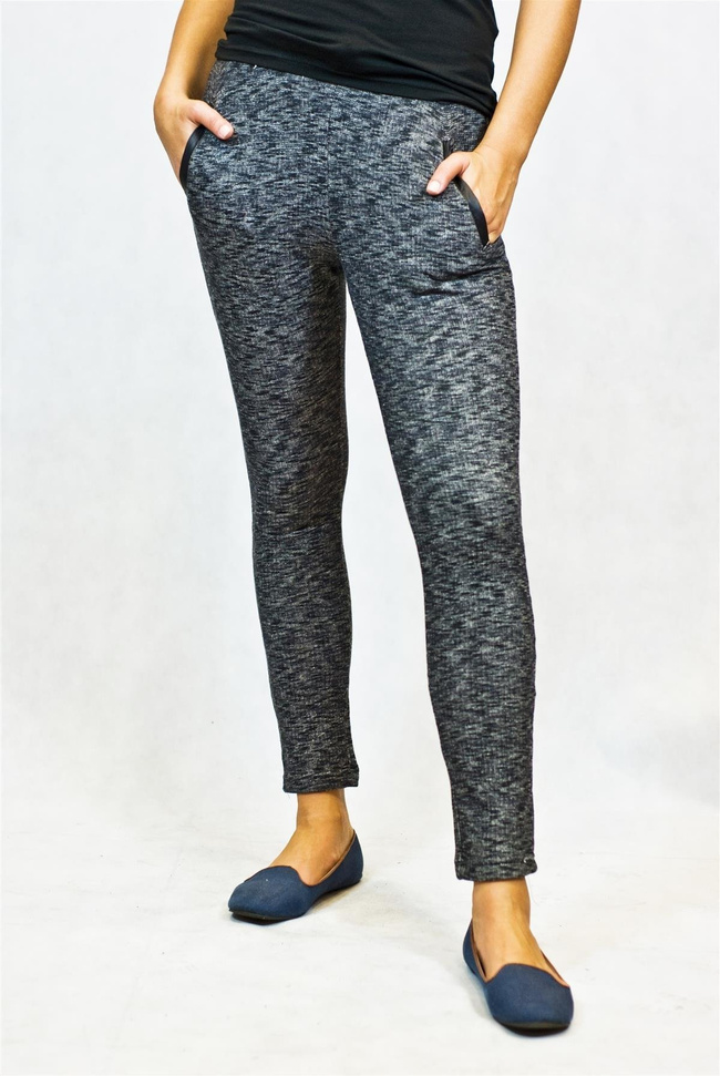 Modne, luźne spodnie z dresowego, melanżowego materiału. Spodnie ze zwężanymi nogawkami, w pasie wiązane na sznurek. Kieszenie obszyte skórką. Wygodne spodnie, idealne na co dzień, jak również świetnie sprawdzą się jako wygodny strój na siłownię czy fitness.