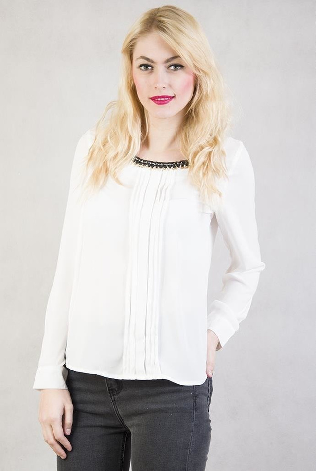 Bluzka z przedłużanym tyłem i złotym łańcuszkiem przy dekolcie.