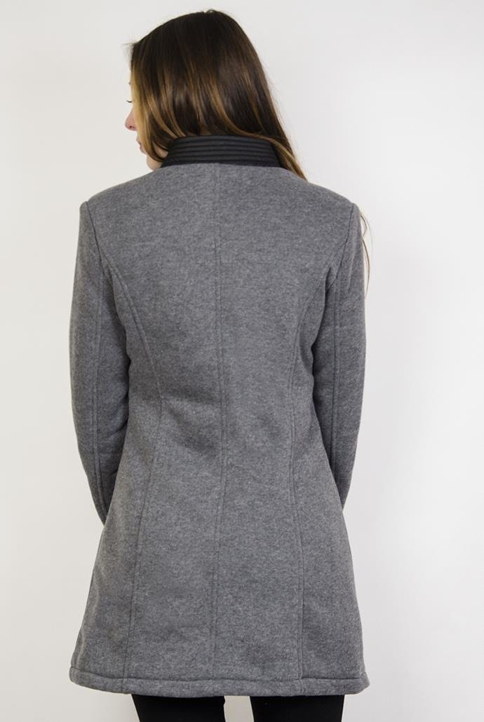 Ciemno-szary płaszcz ze skórkowymi wstawkami, zapinany na zamek.