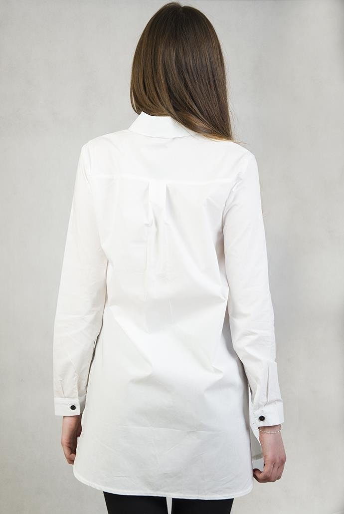 Biała, długa koszula z literką "A" oraz naszywką na dole.