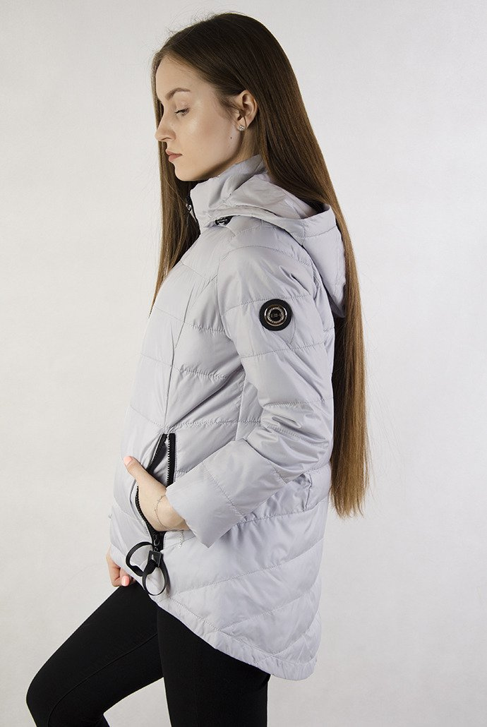 Asymetryczna szara kurtka z kapturem zapinana na zamek.