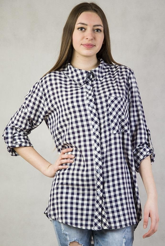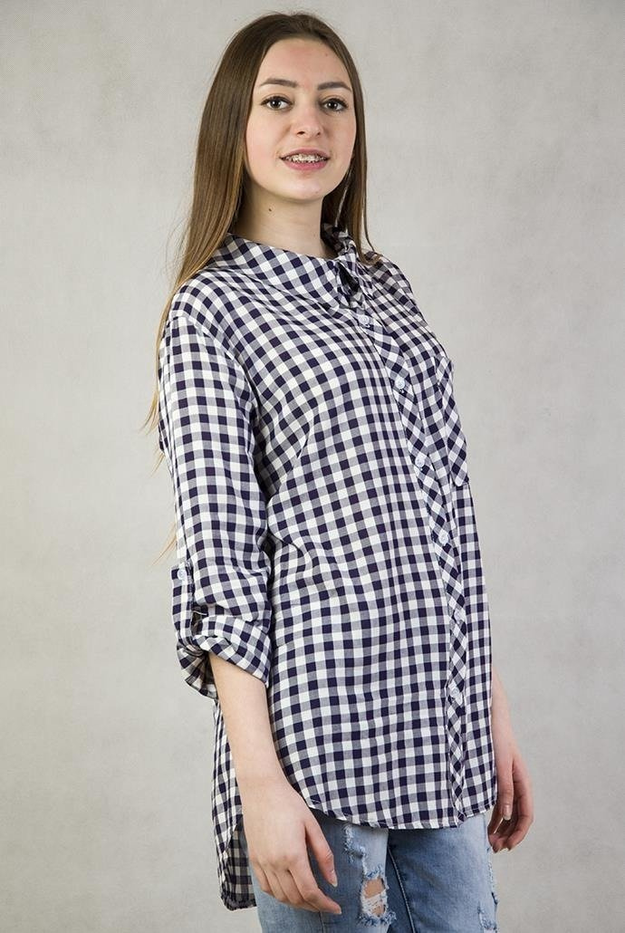 Asymetryczna Koszula w fioletowo-białą kratę z kieszonką z przodu oraz z tyłu wiązana na kokardkę.