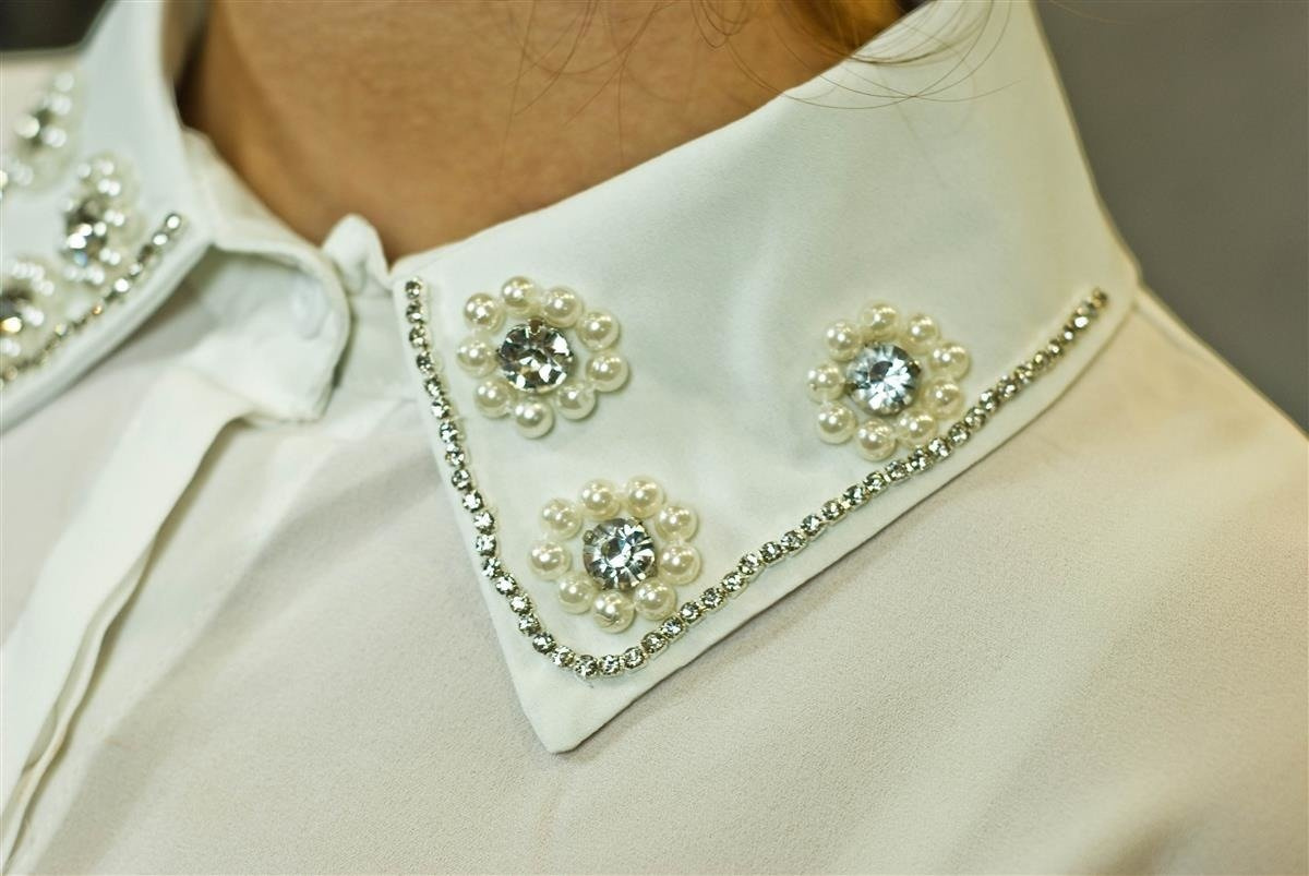 Elegancka koszula z cienkiego, lekko prześwitującego materiału, ze zdobionym kołnierzykiem, idealna na wiele okazji.