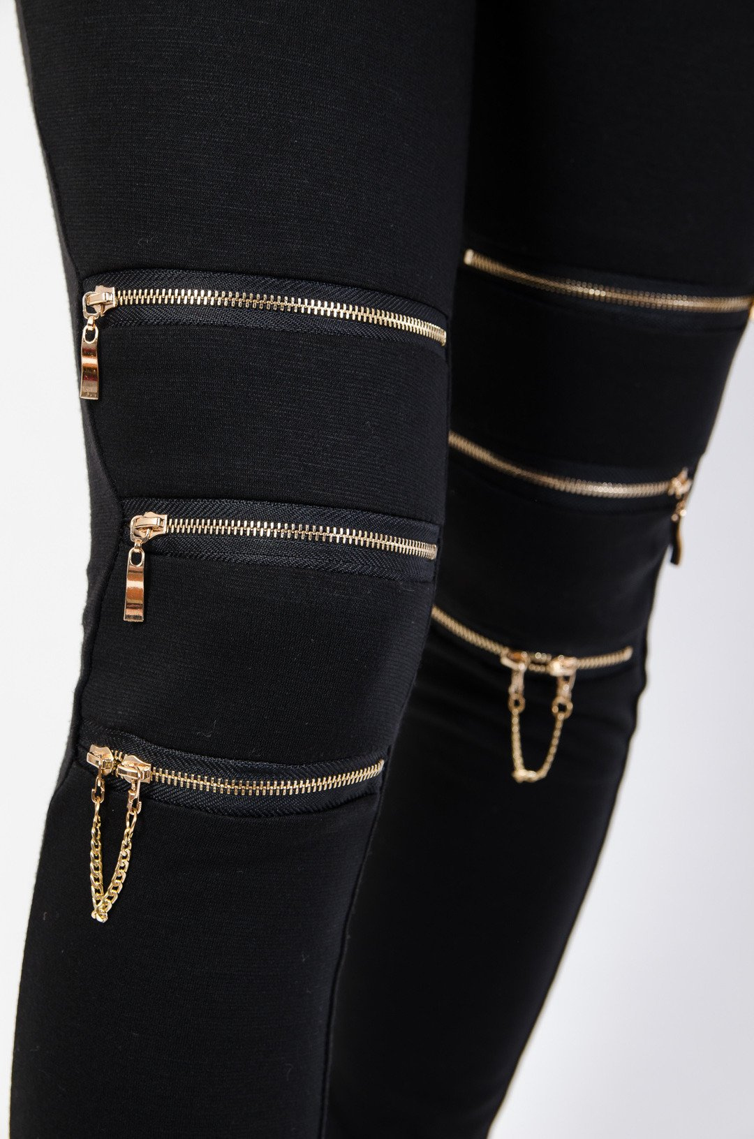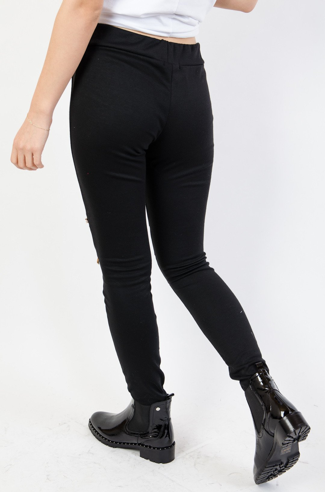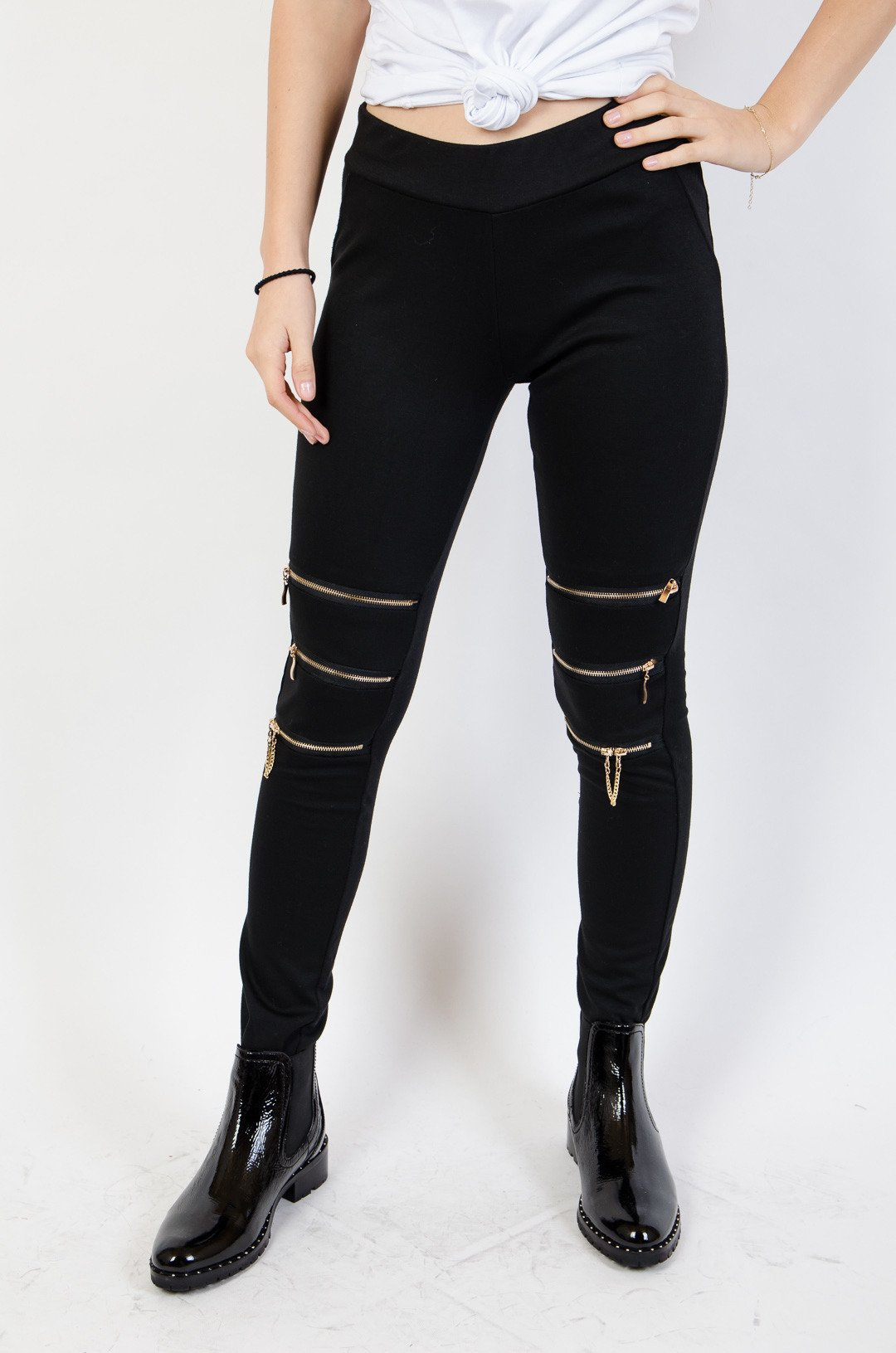 Czarne spodnie - legginsy z zamkami na nogawkach.