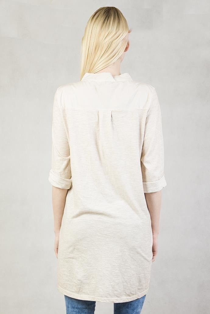 Asymetryczna, beżowa bluzka zapinana na guziki z kieszonką po boku.