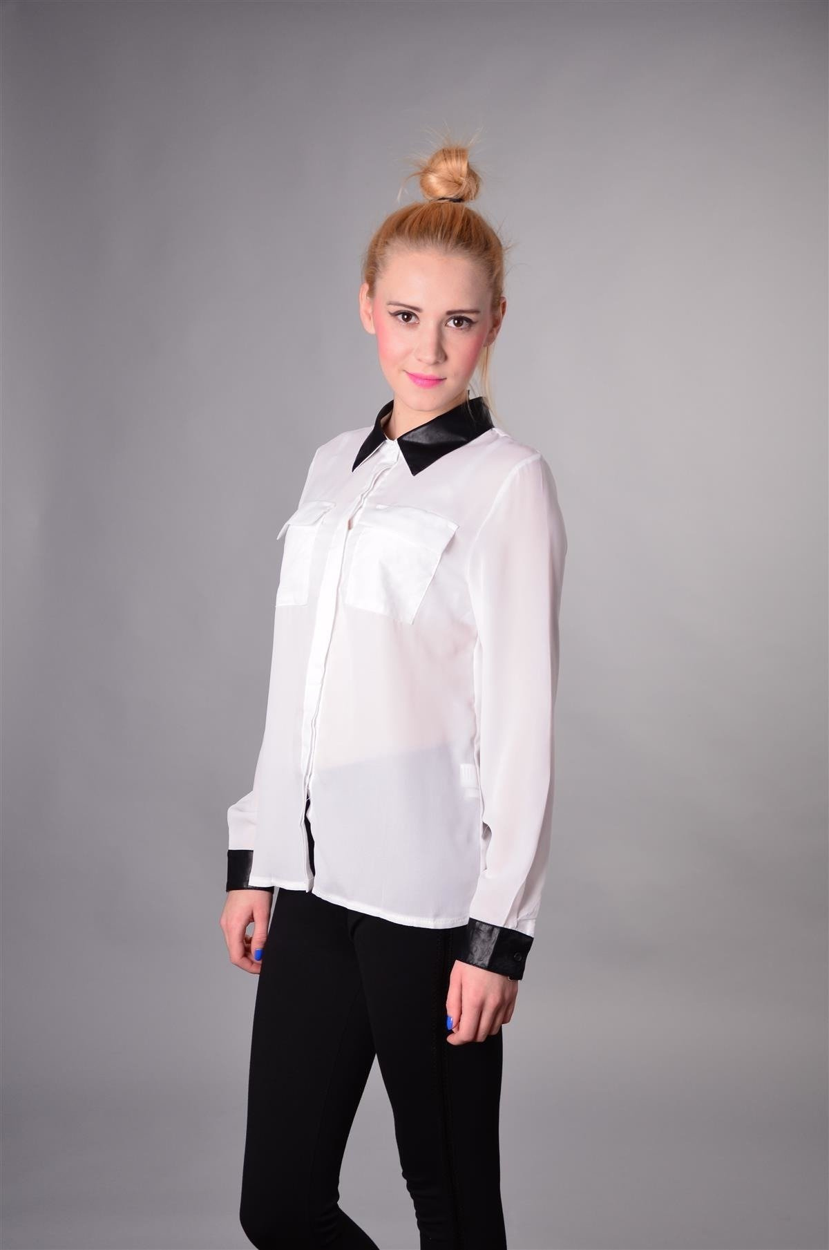 Elegancka koszula z cienkiego, lekko prześwitującego materiału. Klasyczna, ze skórkowym kołnierzykiem, oraz mankietami, które nadają jej uroku, idealna na wiele okazji.