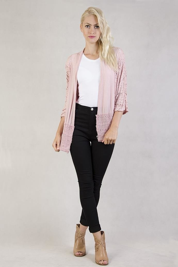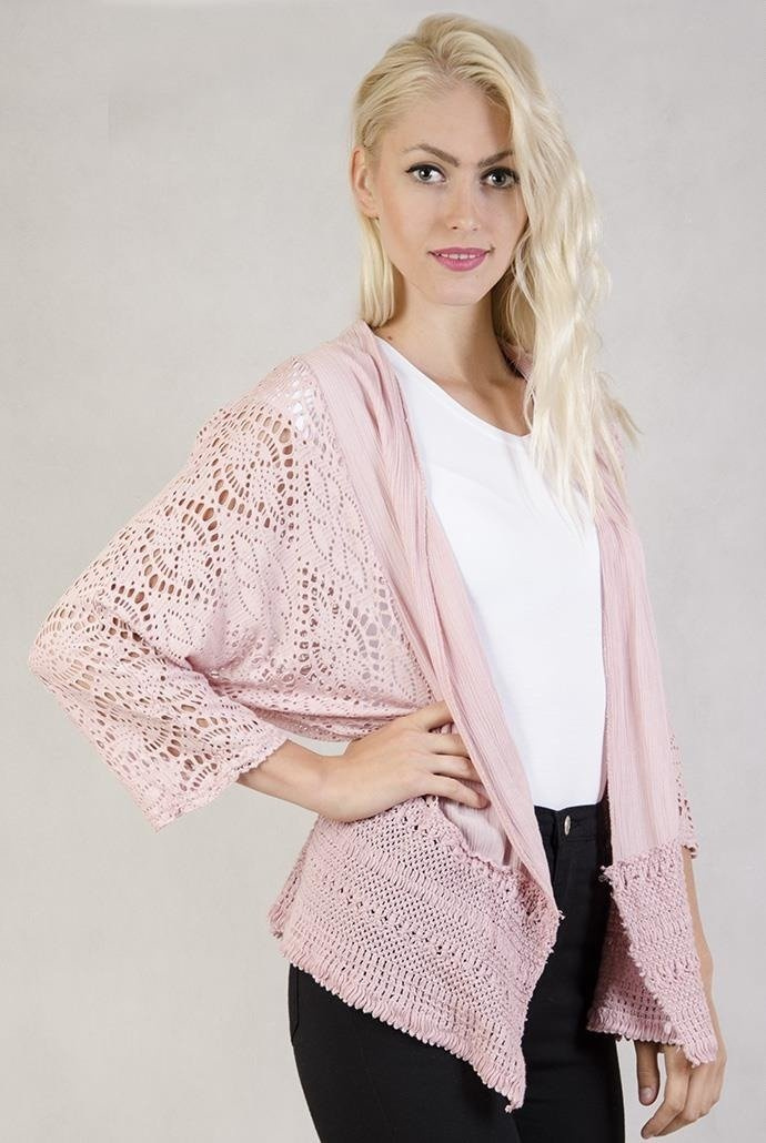 Koronkowa narzutka z szerokim plecionym pasem na dole różowa