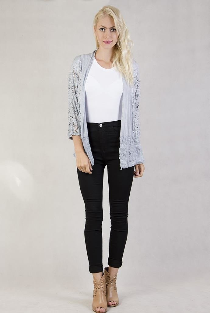 Koronkowa narzutka z szerokim plecionym pasem na dole szara