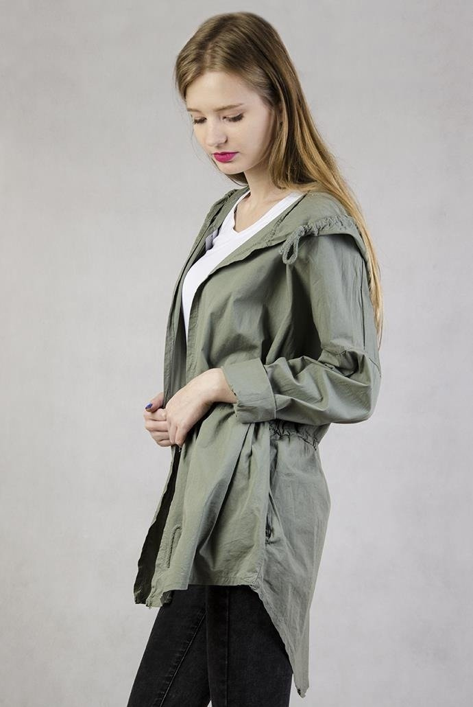 Zielona narzuta z kapturem, ściągana w pasie