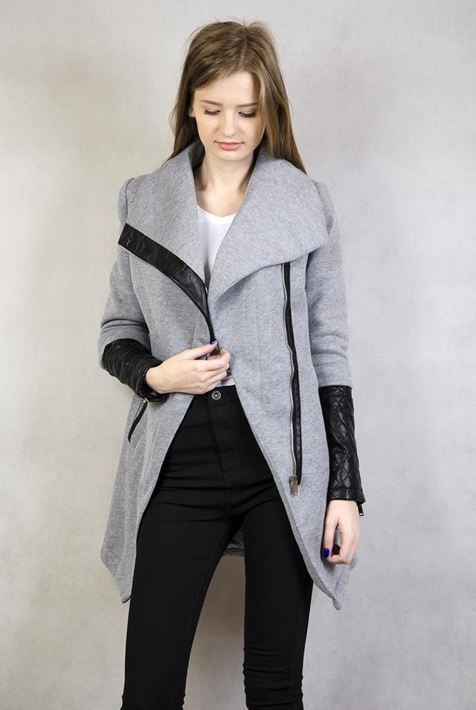 Jasnoszary płaszcz zapinany na zamek, z wywijanym kołnierzem, idealny na jesień.
