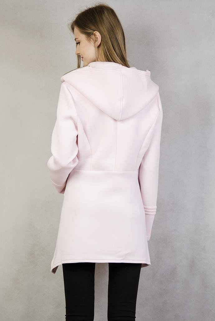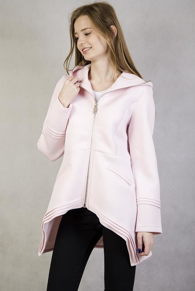 Wygodny, asymetryczny płaszczyk z kapturem.
