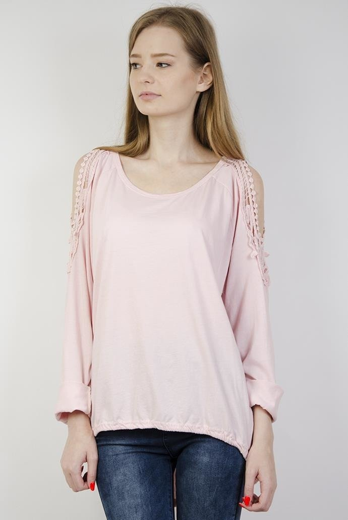 Jasnoróżowa bluzka z wycięciami, ażurowymi wstawkami przy ramionach, z podwijanym rękawem oraz ściągaczem na dole.