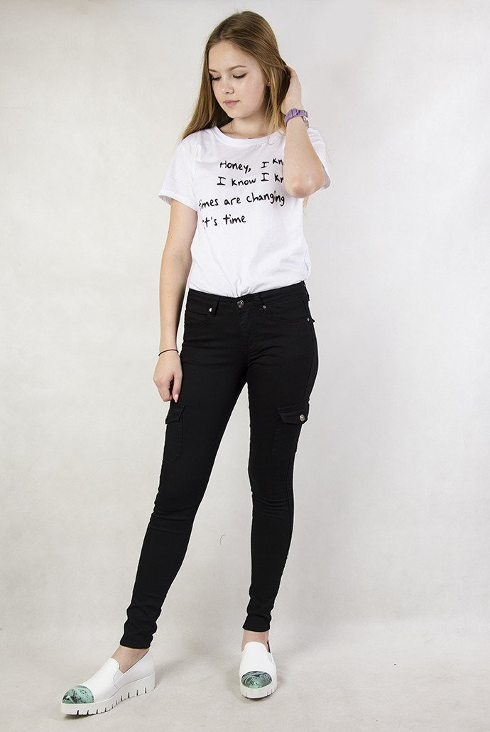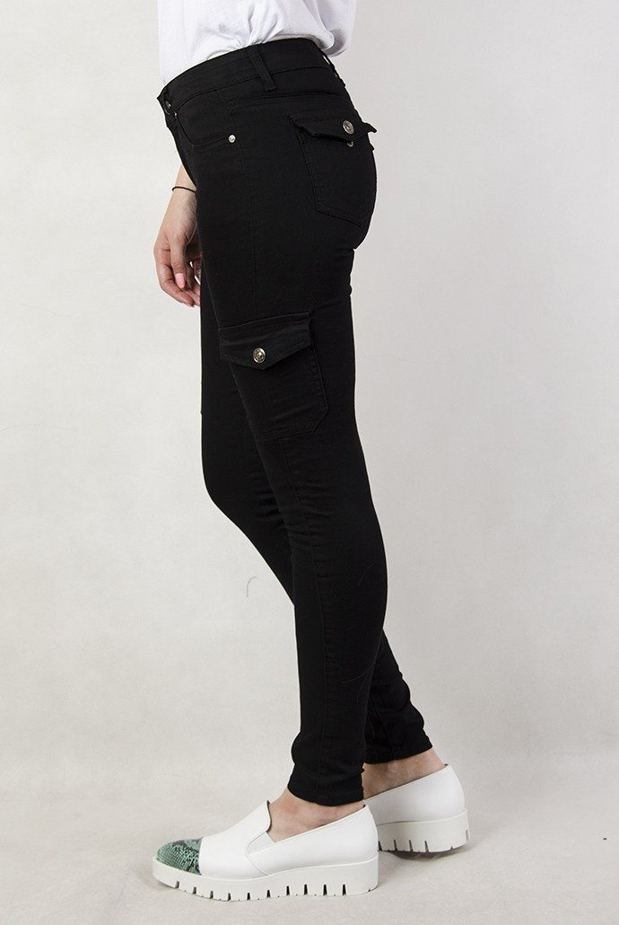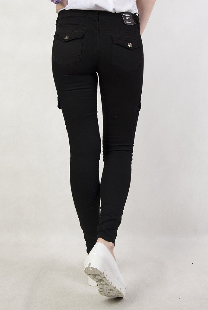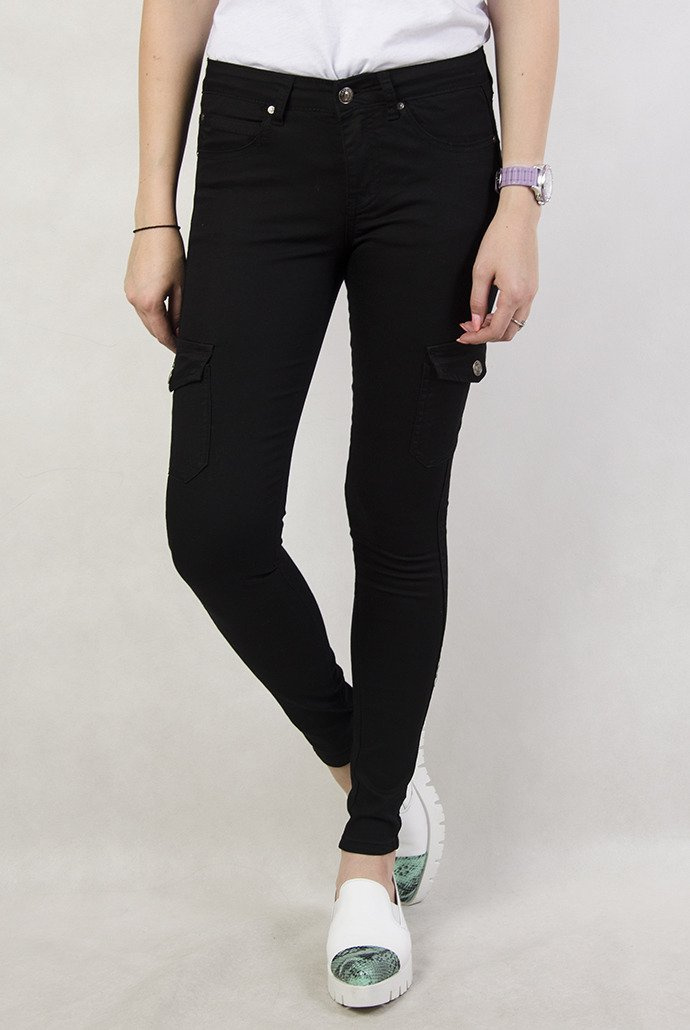 Czarne spodnie bojówki z kieszeniami po bokach.