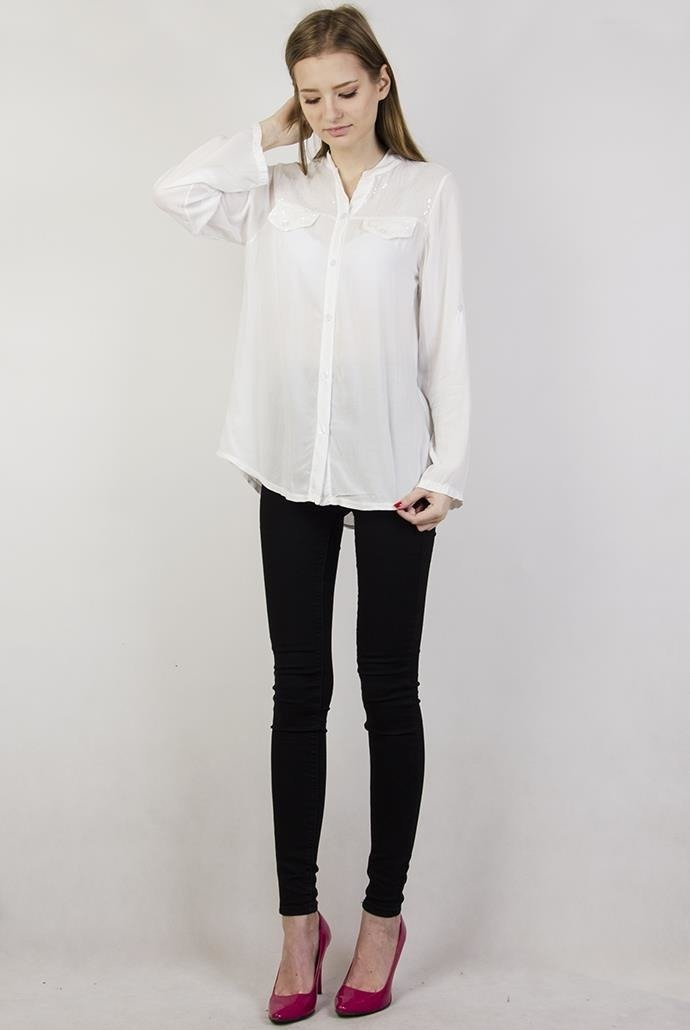 Koszula mgiełka biała z cekinami, asymetryczna Wymiary dla rozmiaru ONE-SIZE: Długość całkowita: 61 cm (przód) 65 cm (tył) Długość rękawa: 59 cm Szerokość pod pachami: 50 cm