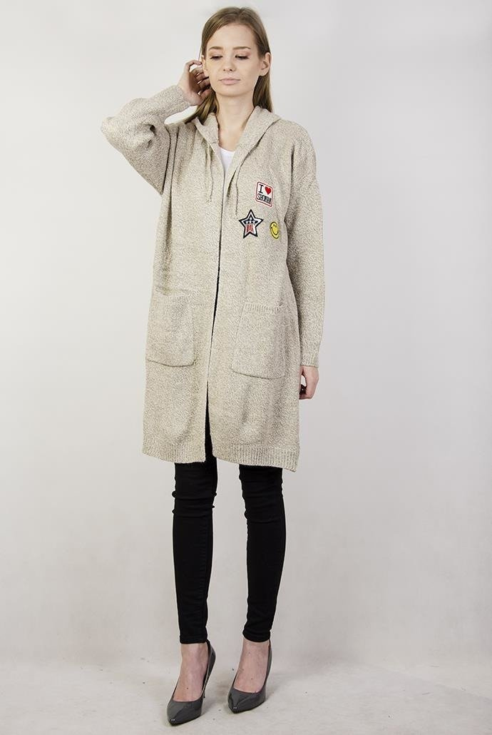 Beżowy kardigan z kapturem i naszywkami oraz szerokimi kieszeniami