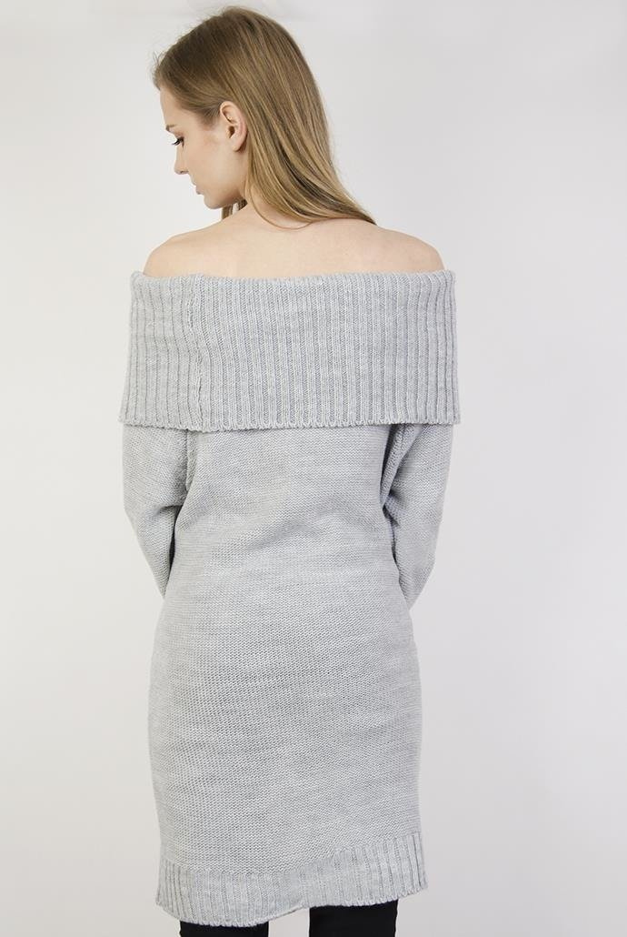 Szary przedłużany sweter z szerokim dekoltem i naszywką na dole