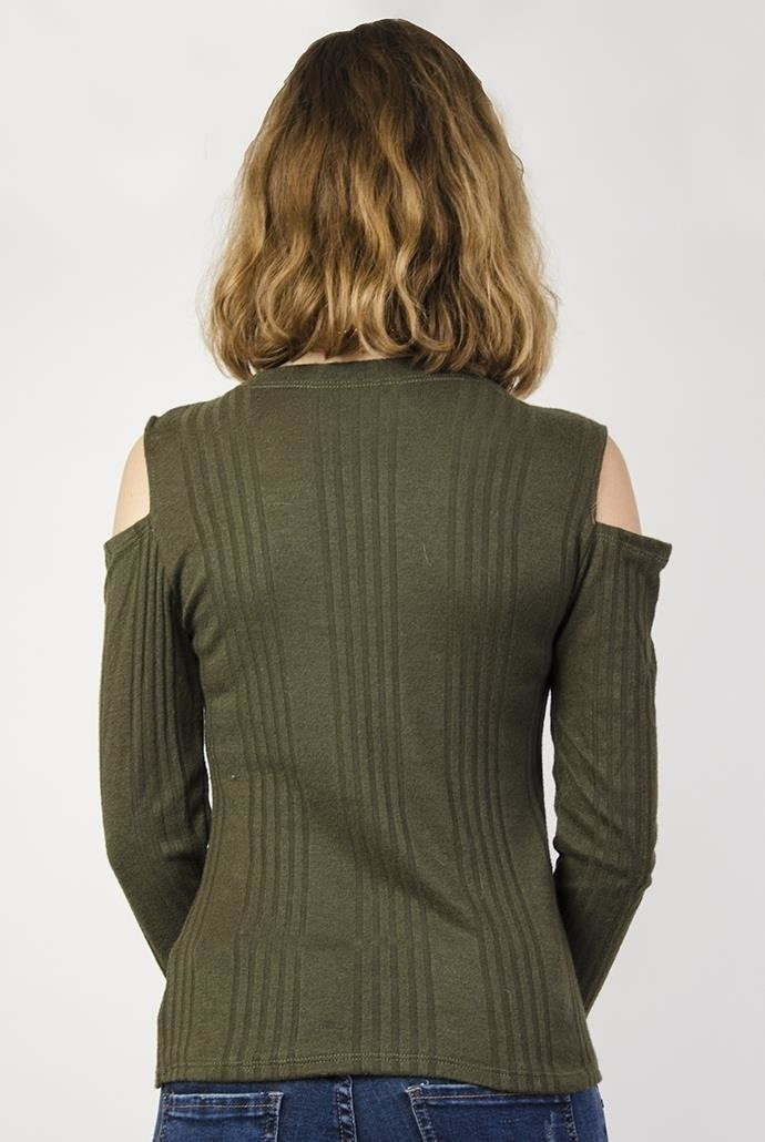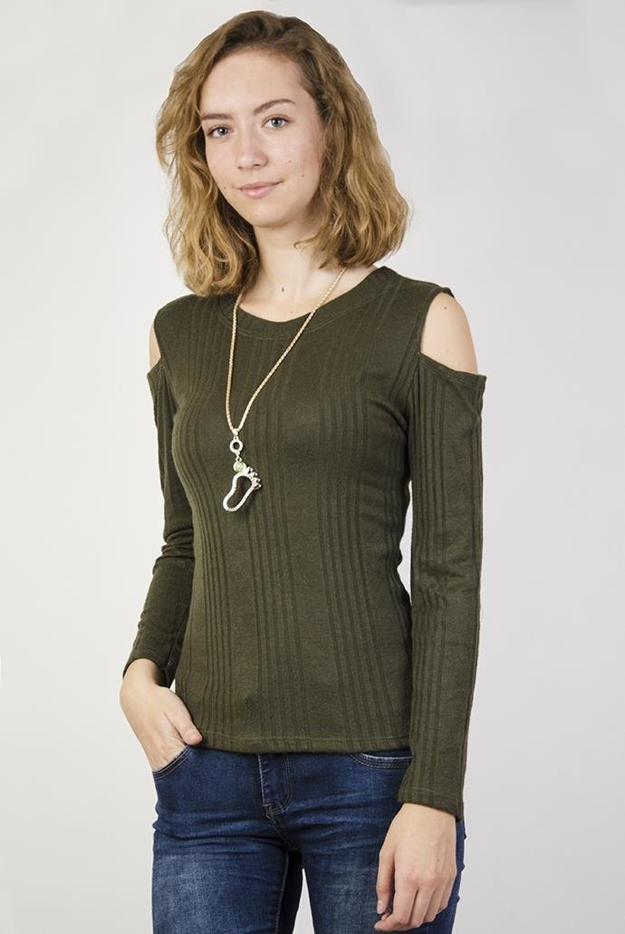 Zielona bluzka z wycięciami na ramionach + wisiorek