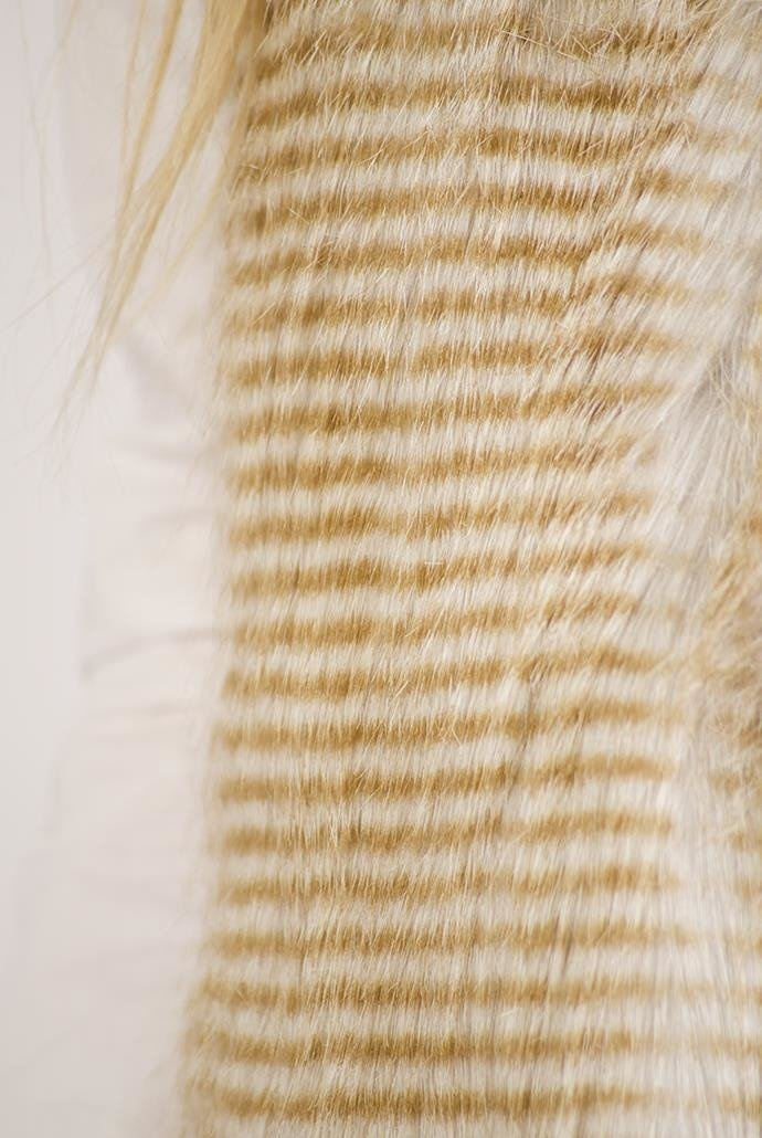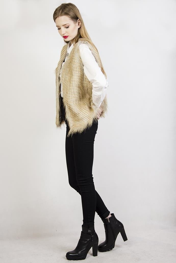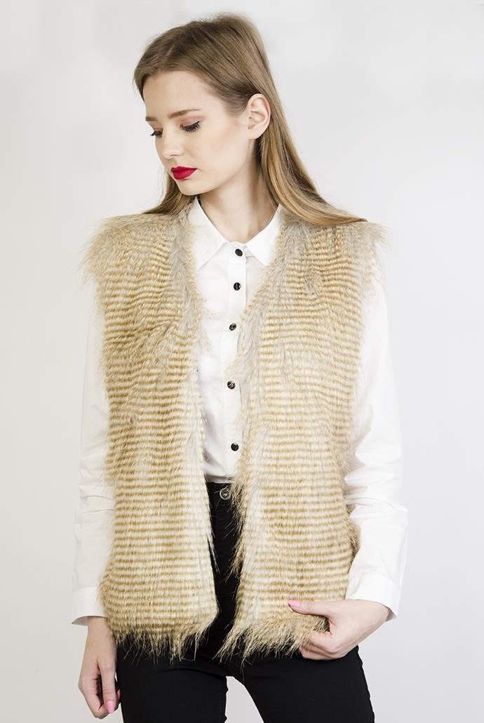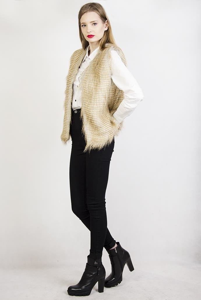 Beżowa, włochata kamizelka z brązowymi paskami. Zapinana na haczyk.