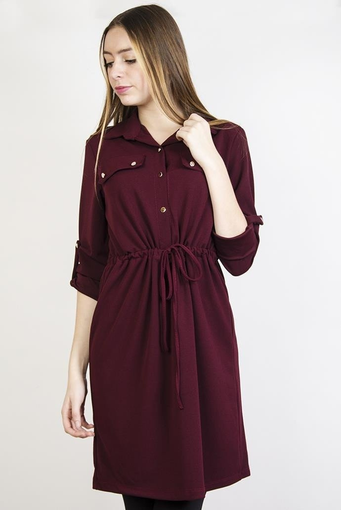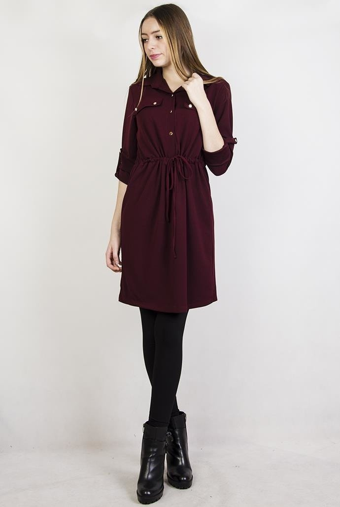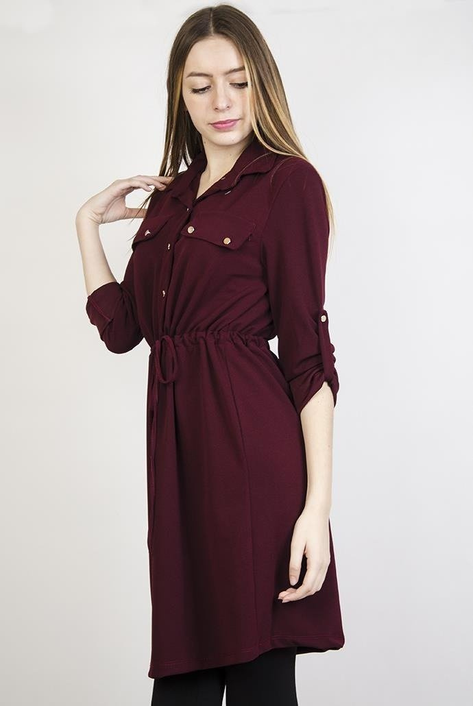 Bordowa sukienka ze ściągaczem w talii, posiada złote guziczki i długi rękaw.