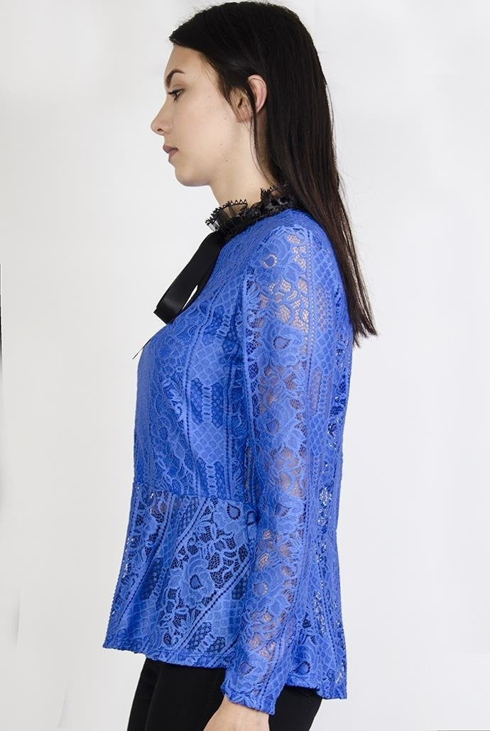 Chabrowa, koronkowa bluzka z baskinką i czarnymi wstawkami. Posiada kokardę przy szyi.