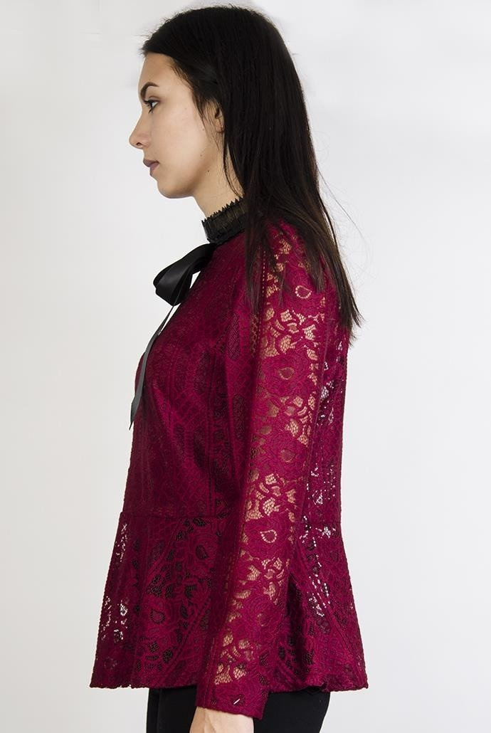 Bordowa, koronkowa bluzka z baskinką i czarnymi wstawkami. Posiada kokardę przy szyi.
