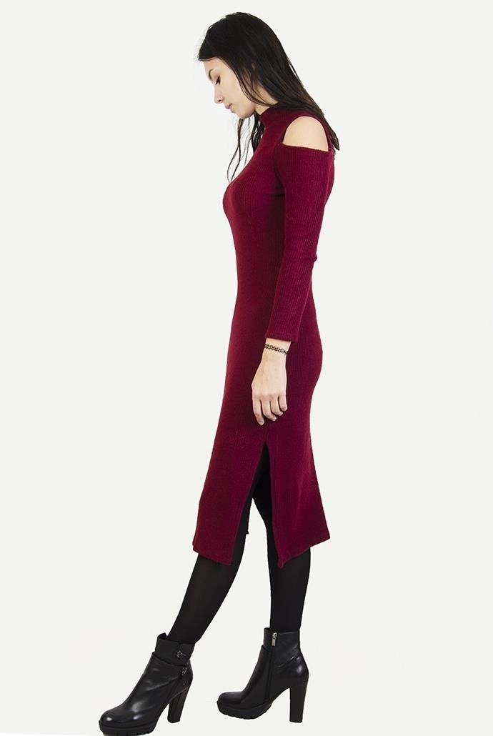 Bordowa, prążkowana sukienka midi z wycięciami na ramionach