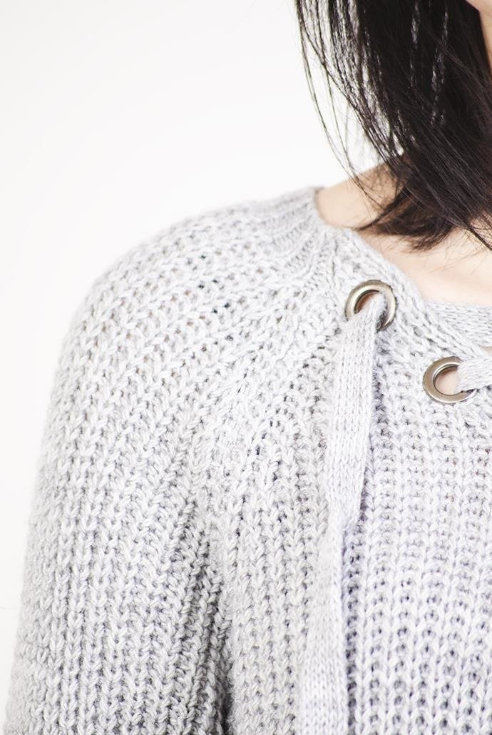 Szary sweter z wiązaniem w dekolcie.