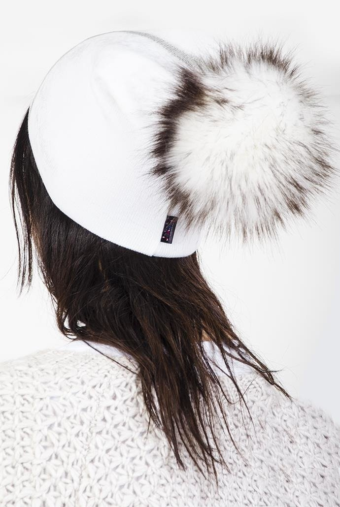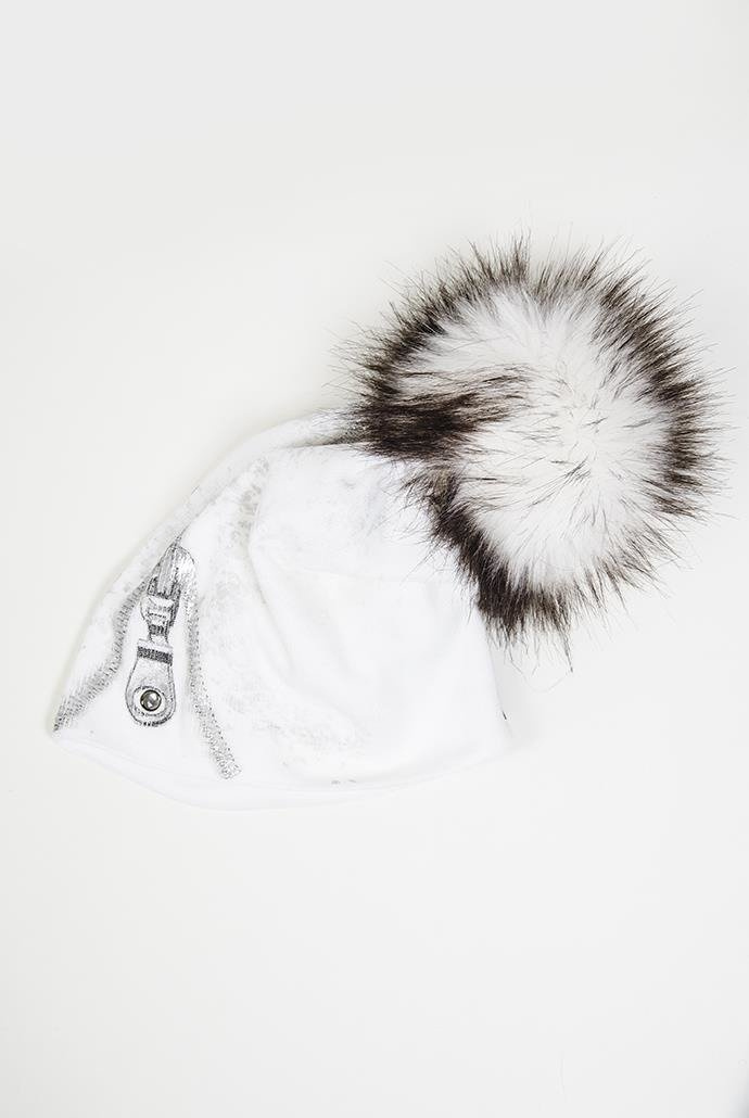 Biała czapka z pomponem i nadrukiem zamkiem.