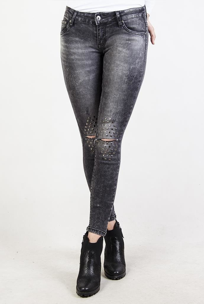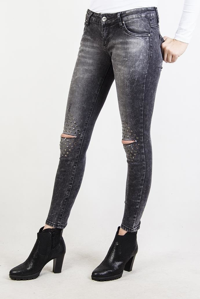Szare spodnie jeansowe, przylegające, z ćwiekami i wycięciami przy kolanie.