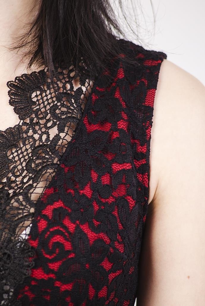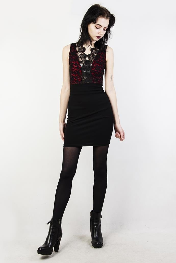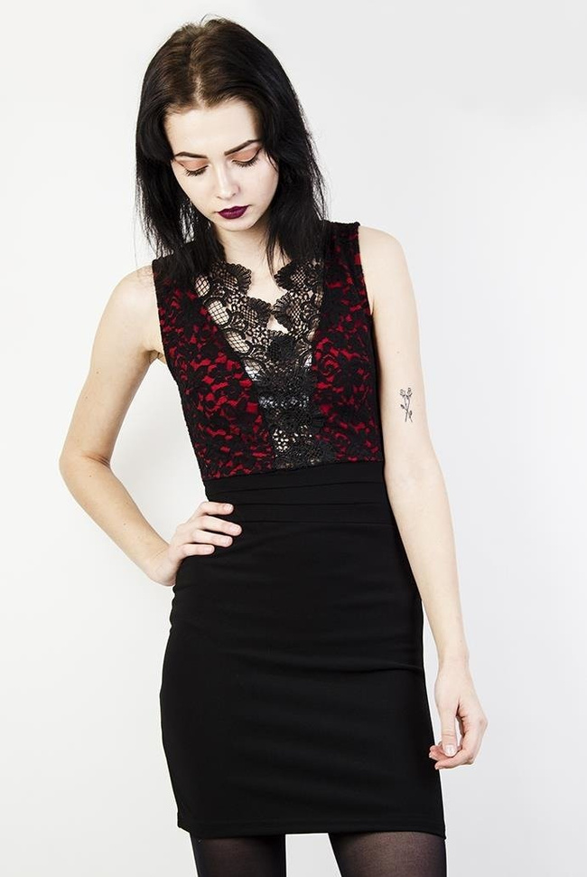 Przylegająca czarno-czerwona sukienka z koronkowymi wstawkami.