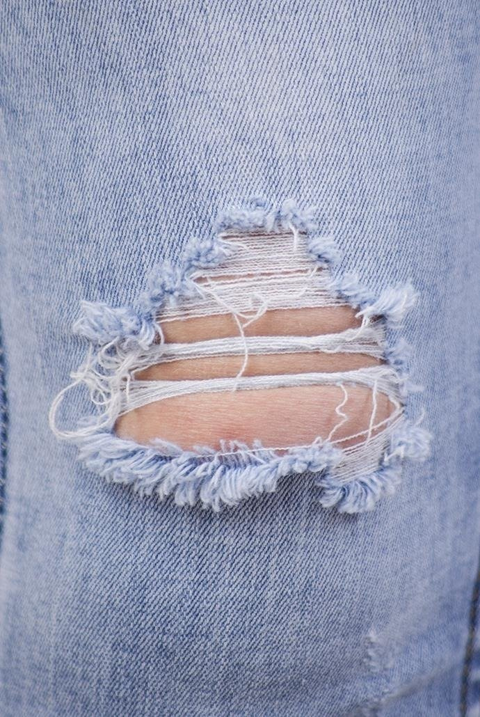Jasne spodnie jeansowe, przylegające, z przetarciami.