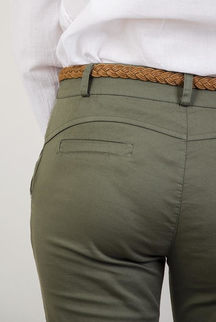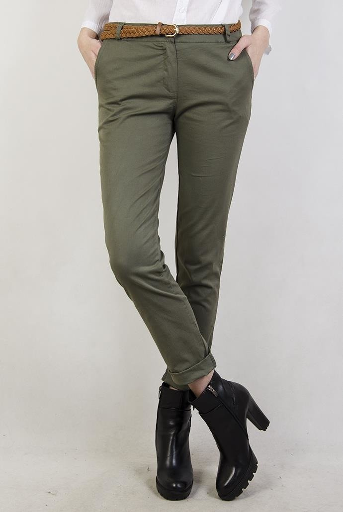 Zielone spodnie materiałowe z brązowym paskiem w zestawie.