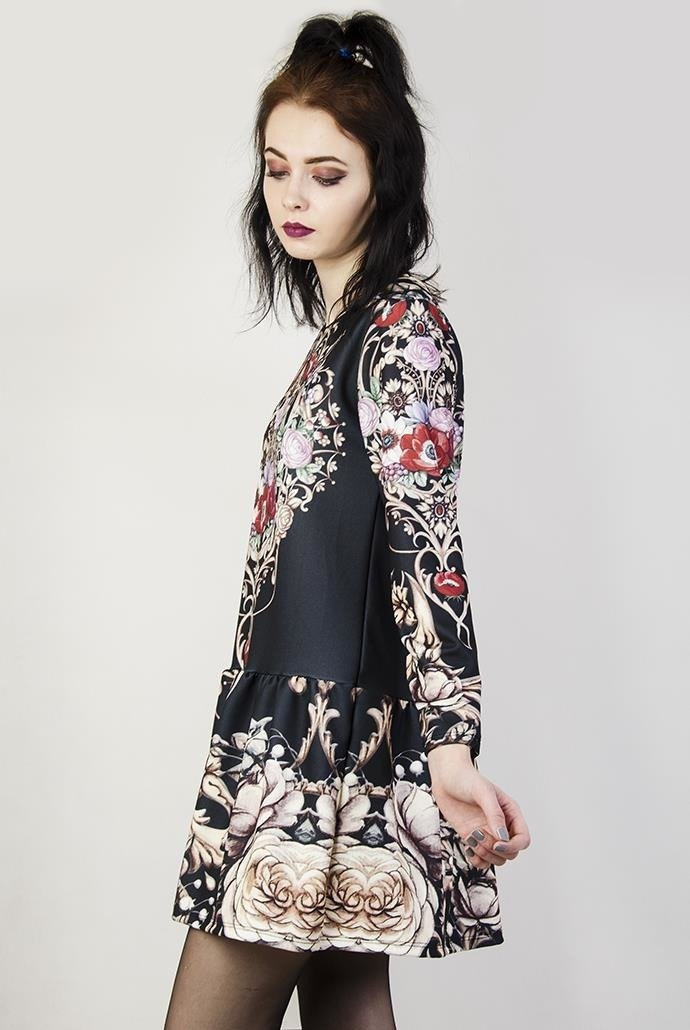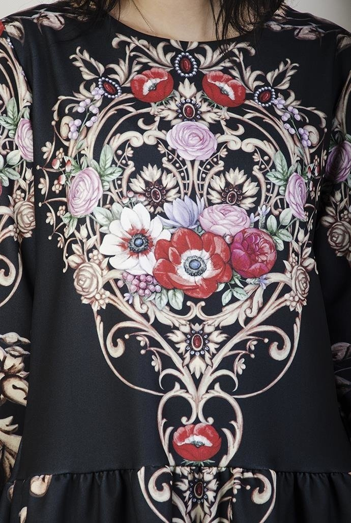 Wzorzysta, czarna sukienka z falbaną na dole.