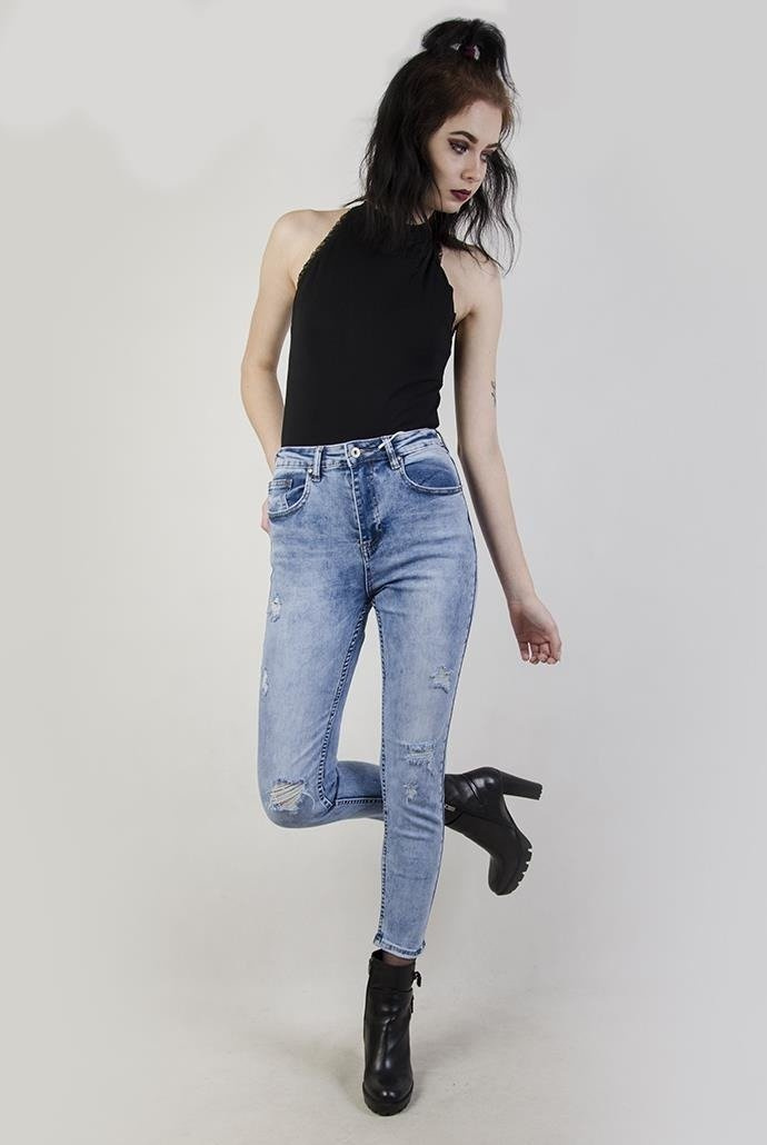 Jasne spodnie jeansowe z przetarciami i cieniowaniem. Wykonane z grubszego jeansu, posiadają wysoki stan.