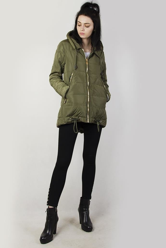 Kurtka khaki przedłużana ze ściągaczem na dole. Posiada kaptur.
