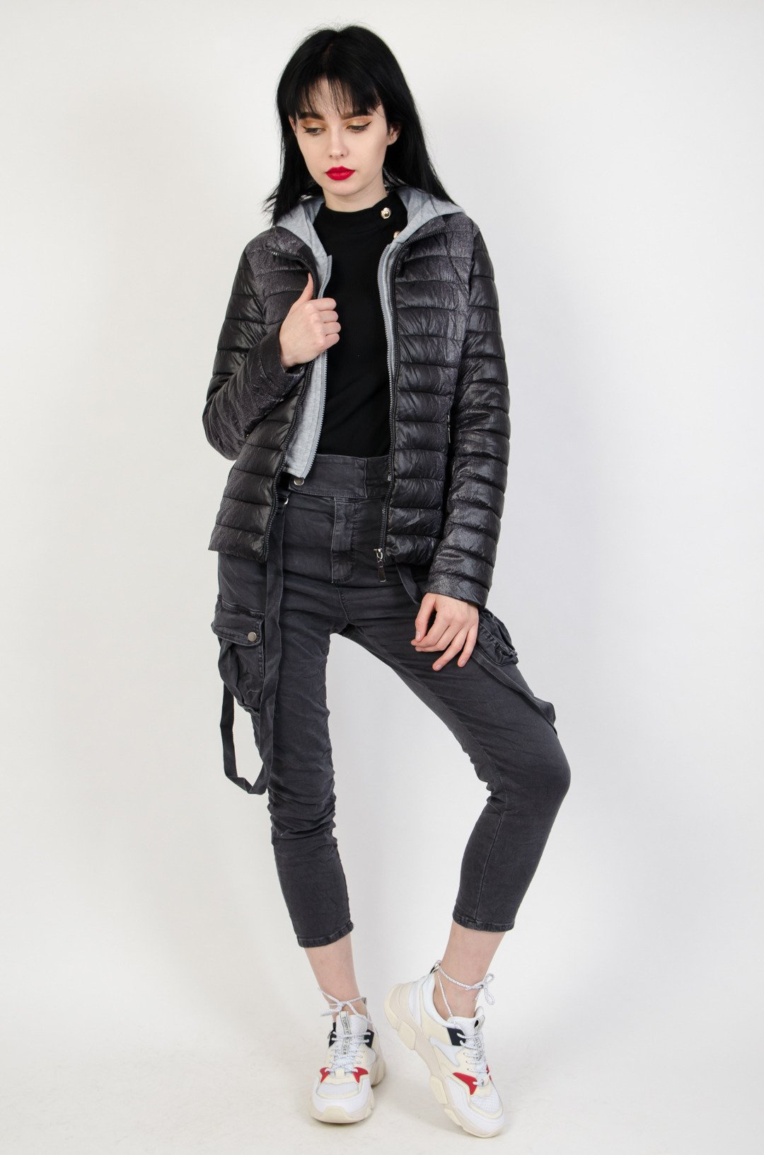 Kurtka pikowana czarna, z szarym podszyciem, które można zapiąć na zamek. Posiada szary kaptur.